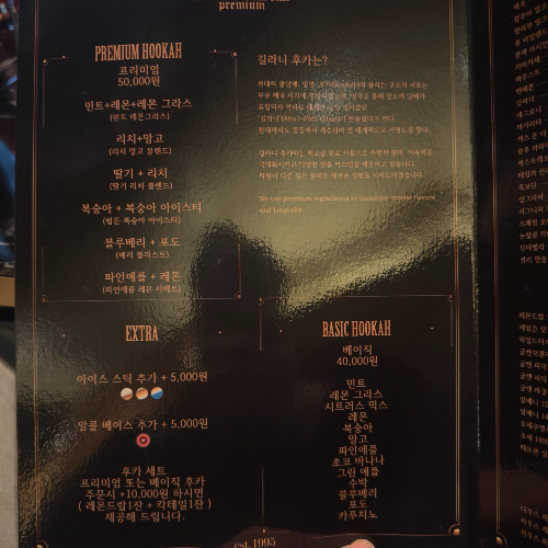 입구에 들어 서면 세련된 바 느낌으로 메니저님이 반갑게 인사하시고, 물담배의 종류 등등 기호에 맞게 추천을 해주신다.
