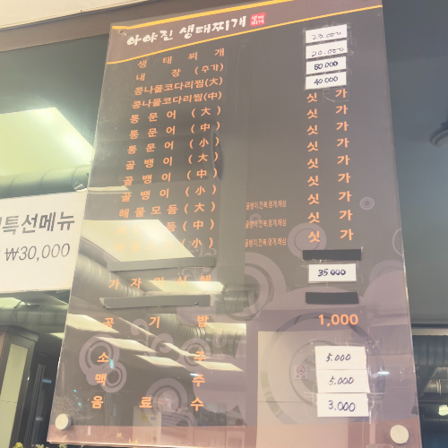 생태찌개도 23,000원 저게 1인분 금액이다. 2인분 절대 아니다. ㅎㅎ