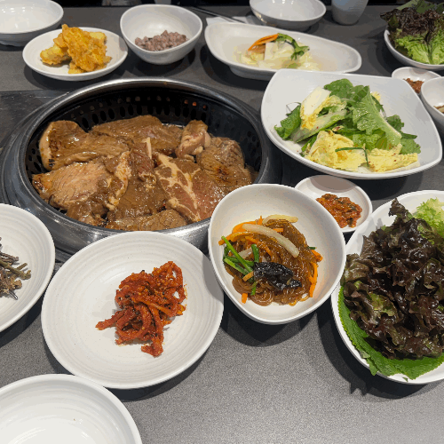 이렇게 많은 가지수의 음식들과 양념 갈비가 나오고, 고기는 당연하게 구워 주신다.