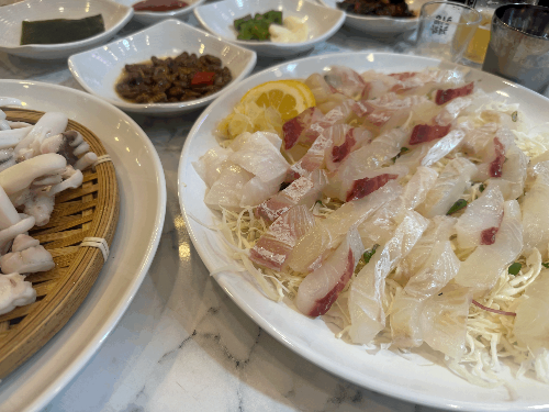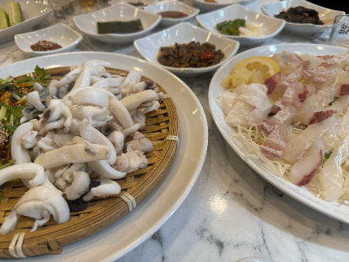 드디어 나온 막회와 갑오징어 숙회 .. 막회는 생각보다 양이 많고 두께 또한 두툼해서 훌륭했다.