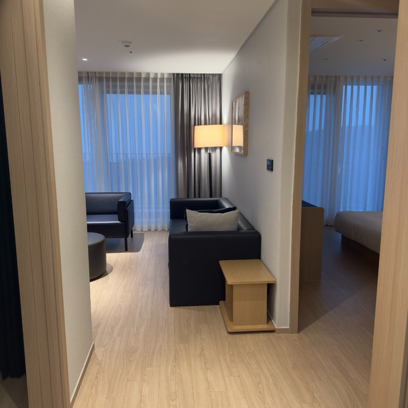 가족이 놀러 와서 머무른다면, 5명도 충분하게 잘 수 있는 공간이다. 객실이 두 개에 화장실도 두 개. 넓은 거실에 모여 이야기할 수 있는 공간도 충분하고....  이 정도면 보통 50만 원 정도에 예약할 수 있는 객실인데..