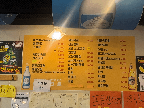 피문어는 싯가로 판매하고 있었고 메뉴는 다양하고 가격이 비싸지는 않았습니다.