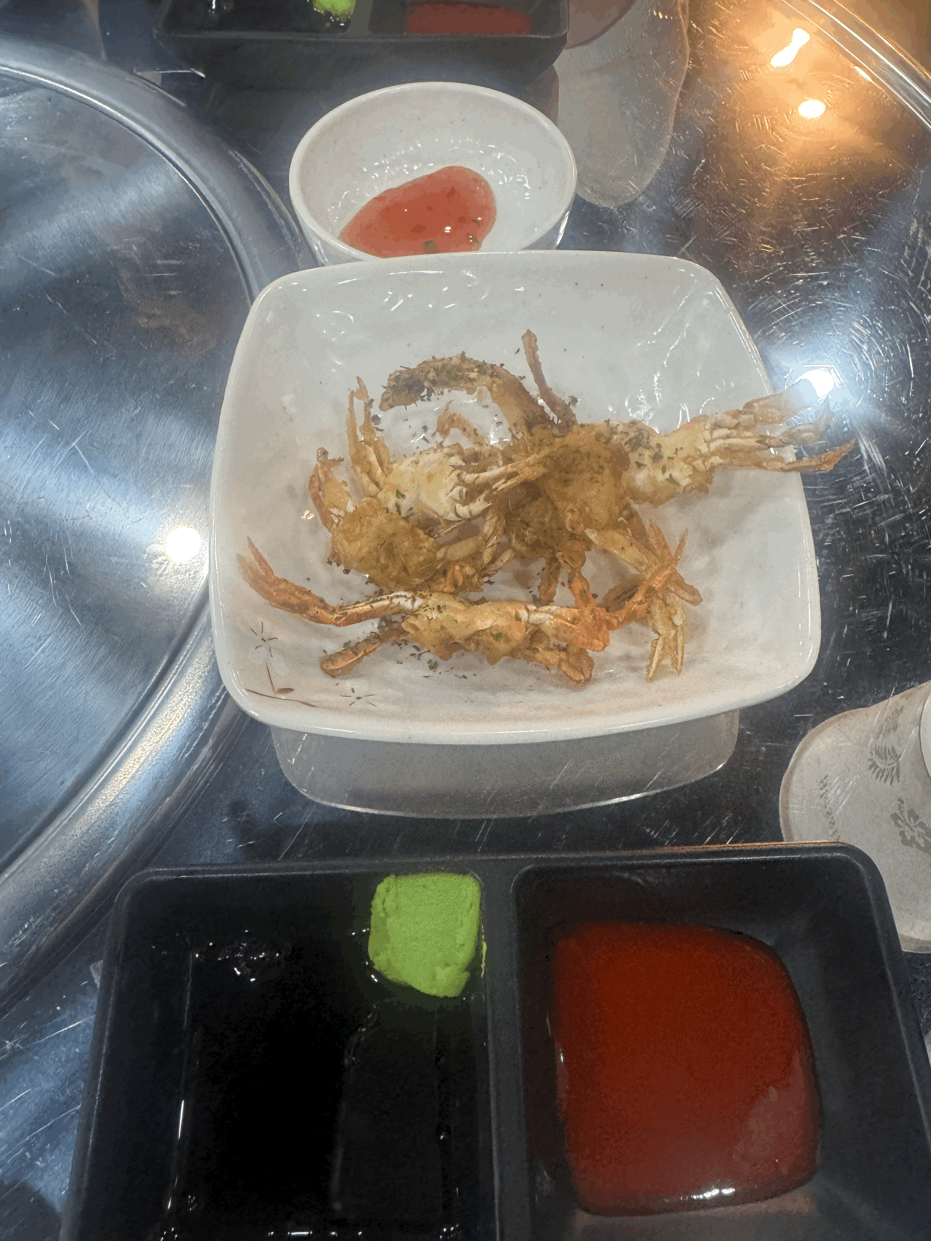 자리에 앉으면 우선 요로콤 튀긴 게가 나오는데 이녀석이 별미입니다. 간단하게 소주 한 병은 이 녀석과 할 수 있었습니다.