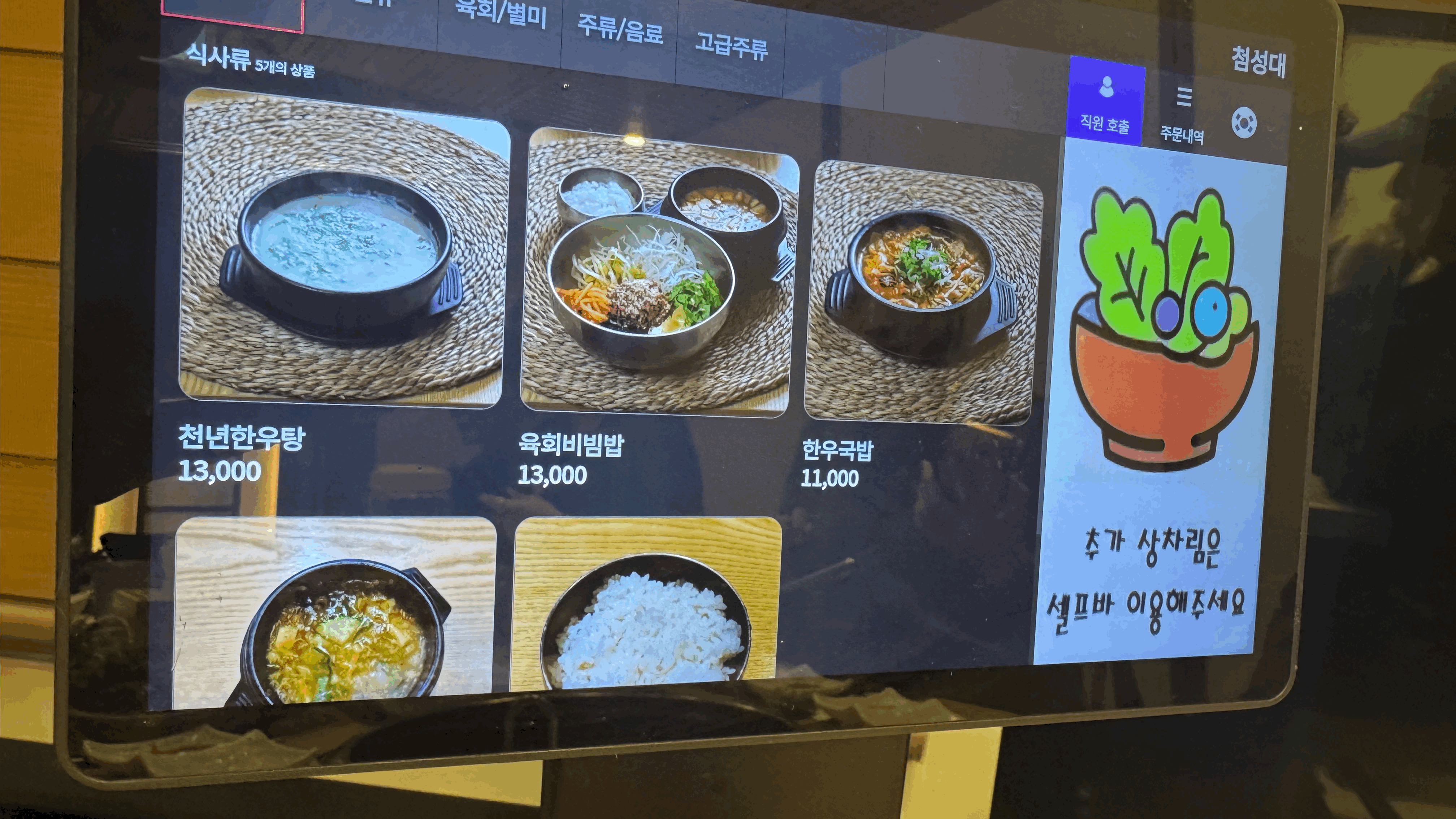 주문은 이렇게 테이블에서 타블렛으로 주문하게 되어 있는데 추가로 나중에 냉면을 시켜 먹었습니다. 우리 식구들은 고기 먹을 때 밥은 먹지 않는 스타일들입니다만 ㅎㅎ 냉면은 어떤 맛일지 궁금해서 맛보기로 하나 시켜 맛만 보았습니다.