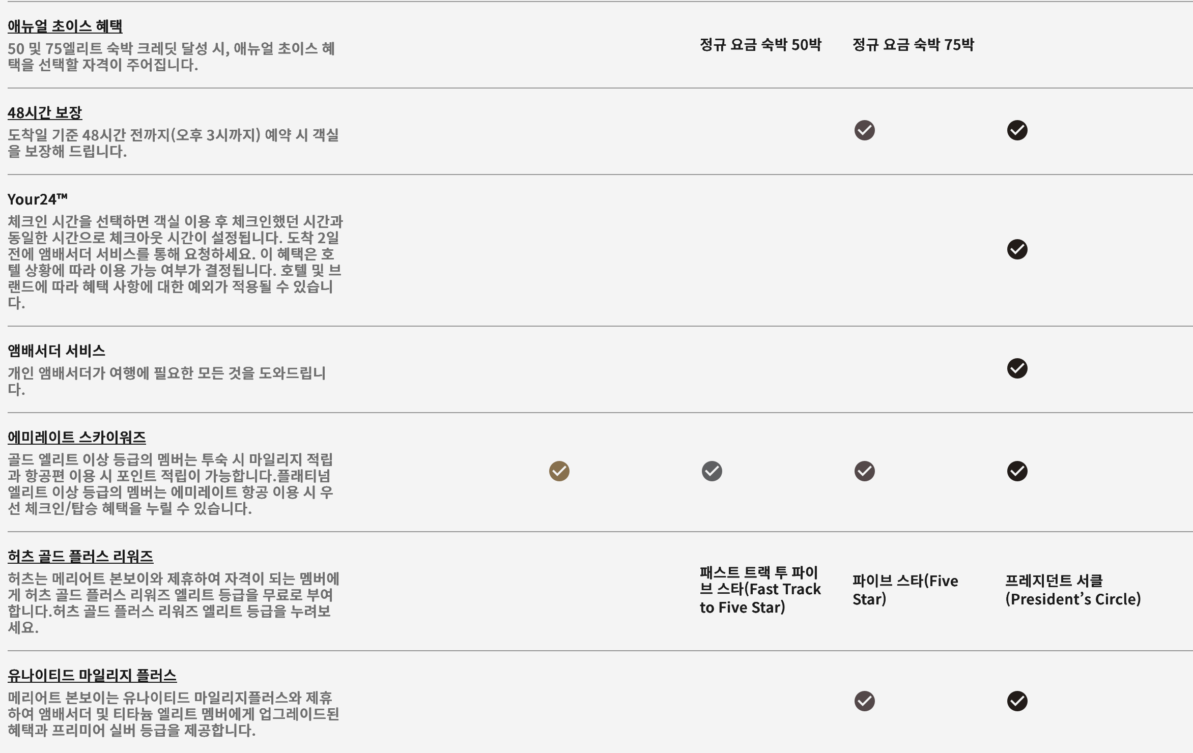 | Titanium Elite | 75박 이상 | 포인트 75% 보너스, 스위트 업그레이드 확률 ↑, 연간 선택 혜택 추가(스위트 업그레이드 어워드 등), 보장 예약 서비스 |
