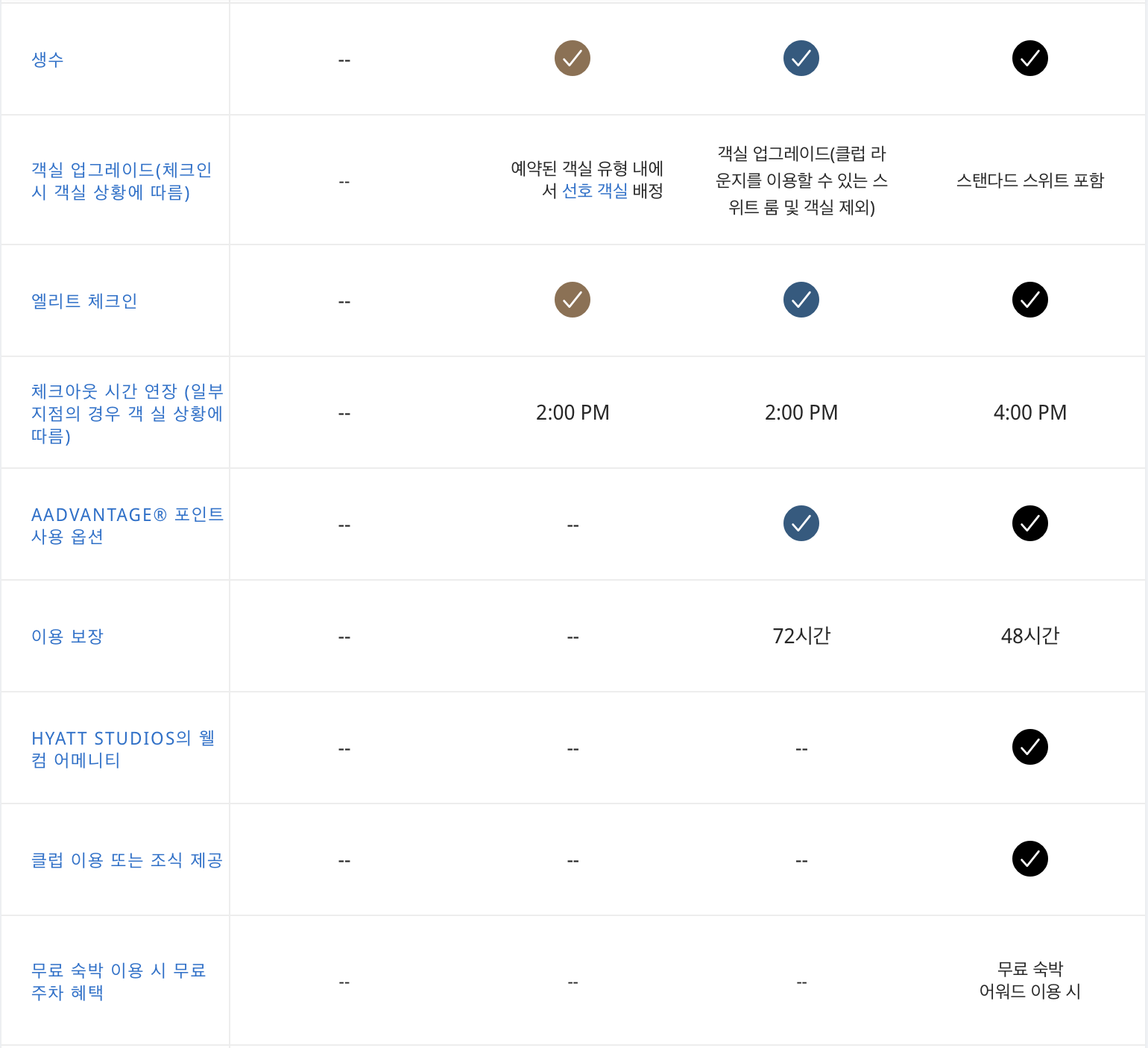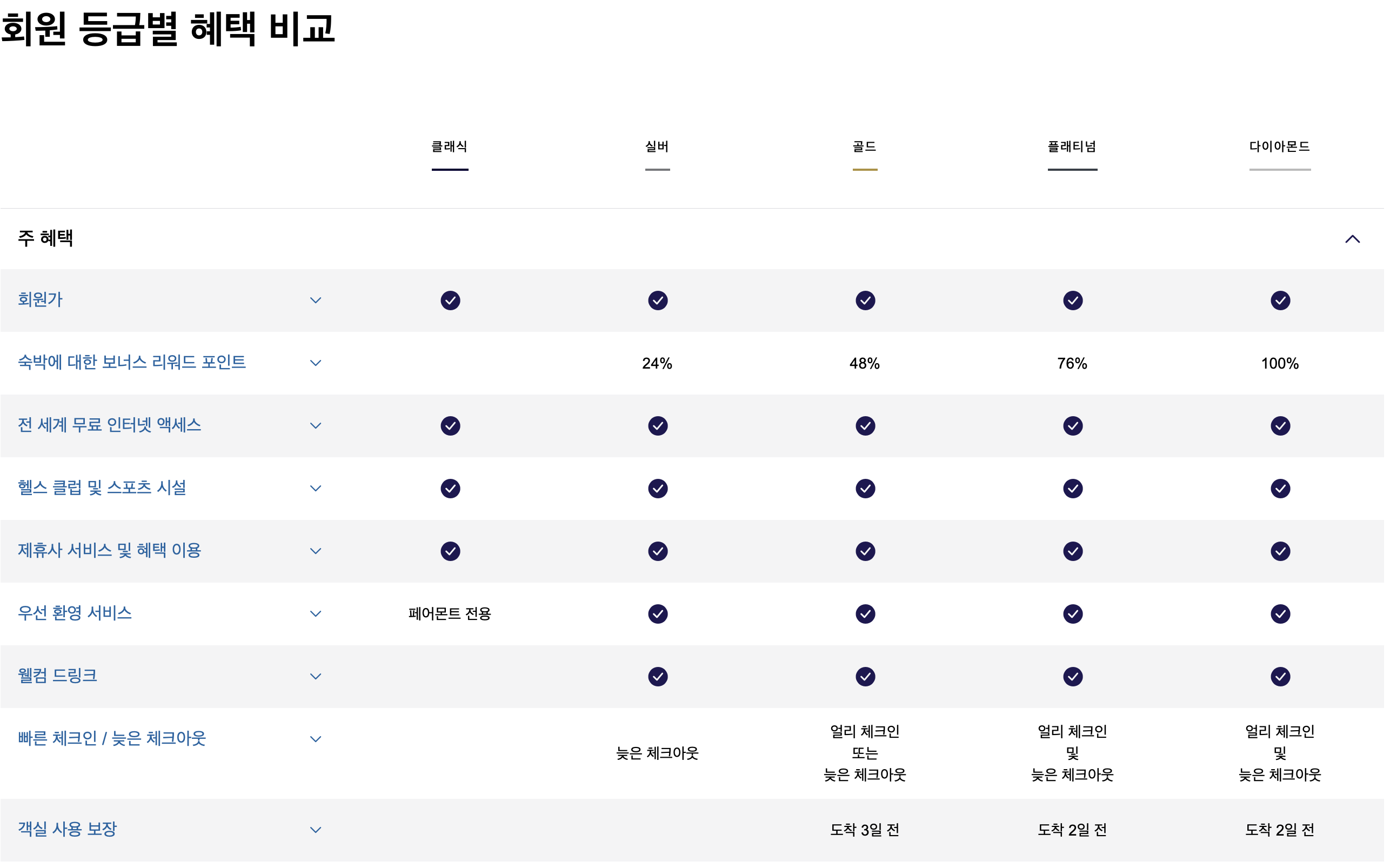 | Explorist | 30박 or 50,000 포인트 or 10 미팅/이벤트 | 객실 업그레이드(스위트 제외), 클럽 라운지 이용권 연 4회, 포인트 20% 보너스, 보장 객실 예약(48시간 전) |