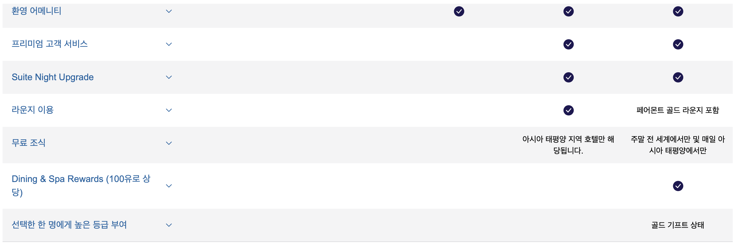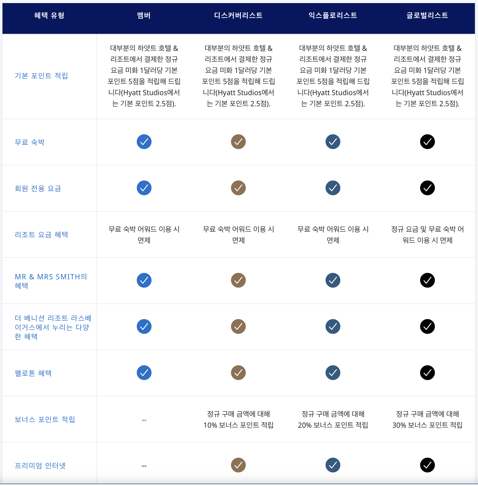 | Discoverist | 10박 or 25,000 포인트 or 3 미팅/이벤트 | 객실 업그레이드(뷰·상위 층 등, 소폭), 레이트 체크아웃(오후 2시), 프리미엄 인터넷, 포인트 10% 보너스 |