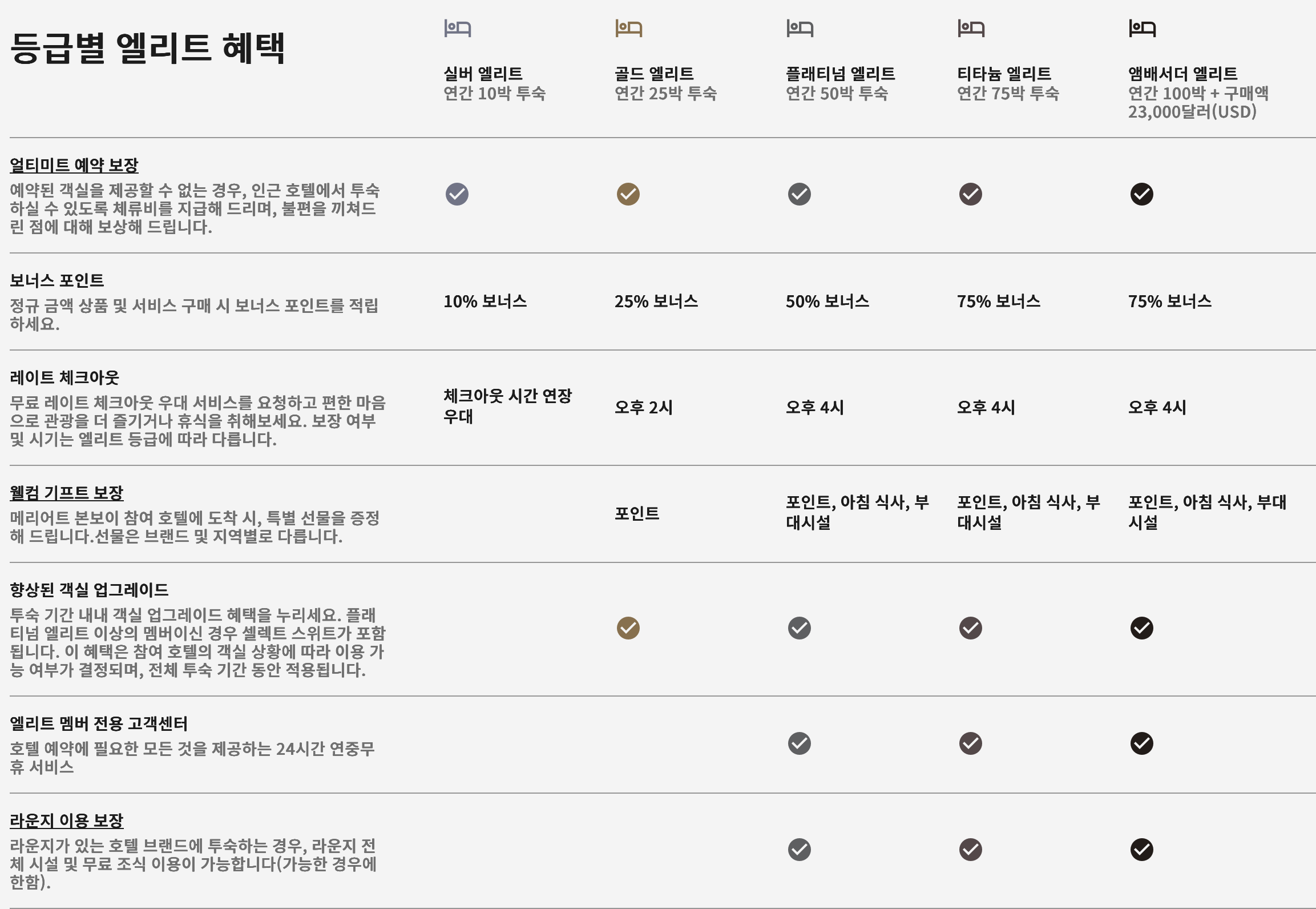 | Platinum Elite | 50박 이상 | 포인트 50% 보너스, 라운지 이용, 조식 무료(브랜드별 정책 다름), 객실 업그레이드(스위트 포함 가능), 레이트 체크아웃(오후 4시), 웰컴 기프트(포인트/조식/음료) |